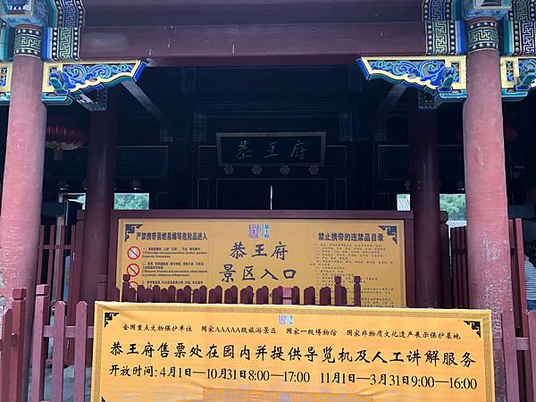匆匆在夜奔民宿放完行李後 開始偉大北京的旅程—第一站 「恭王府」本想說已接近中下午,還在飛機餐半飽的狀態,就先安排了恭王府。因為沒辦法手機打車⋯⋯居然要綁銀行戶。只好拜託好心的民宿工作人員幫忙叫車。 但出租車到了恭王府附近就因為滿滿的人潮跟遊覽車堵這路口,便讓司機放我們在附近下車再步行前往。恭王府的參觀資訊給大家記在下方:•門票:40RMB/人 (6歲或1米2以下幼兒免費、憑學生證可以半價、60歲以上憑證件也是半價)•開放時間:旺季4/1-10/31 8:00~17:00 淡季 9:00~16:00在王府門口旁就是售票處。1
